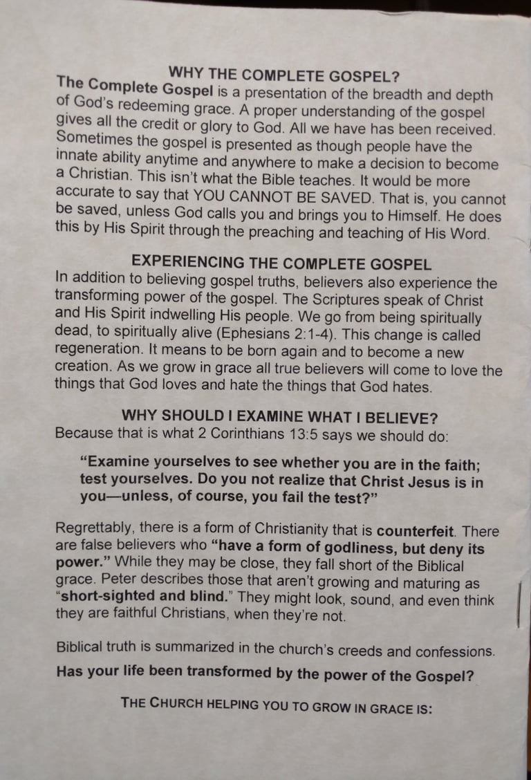 Our solution is a presentation of the Gospel that is rooted in how the Church has understood the Scriptures for over 2000 years. The Complete Gospel is a 48-page booklet that summarizes and states how believers have understood the teachings and doctrines of the Christian Faith. The Bible is the highest and final authority on what is right and true. Because the Bible is inspired by the Holy Spirit it is "profitable for doctrine, correction, reproof, and training in righteousness."